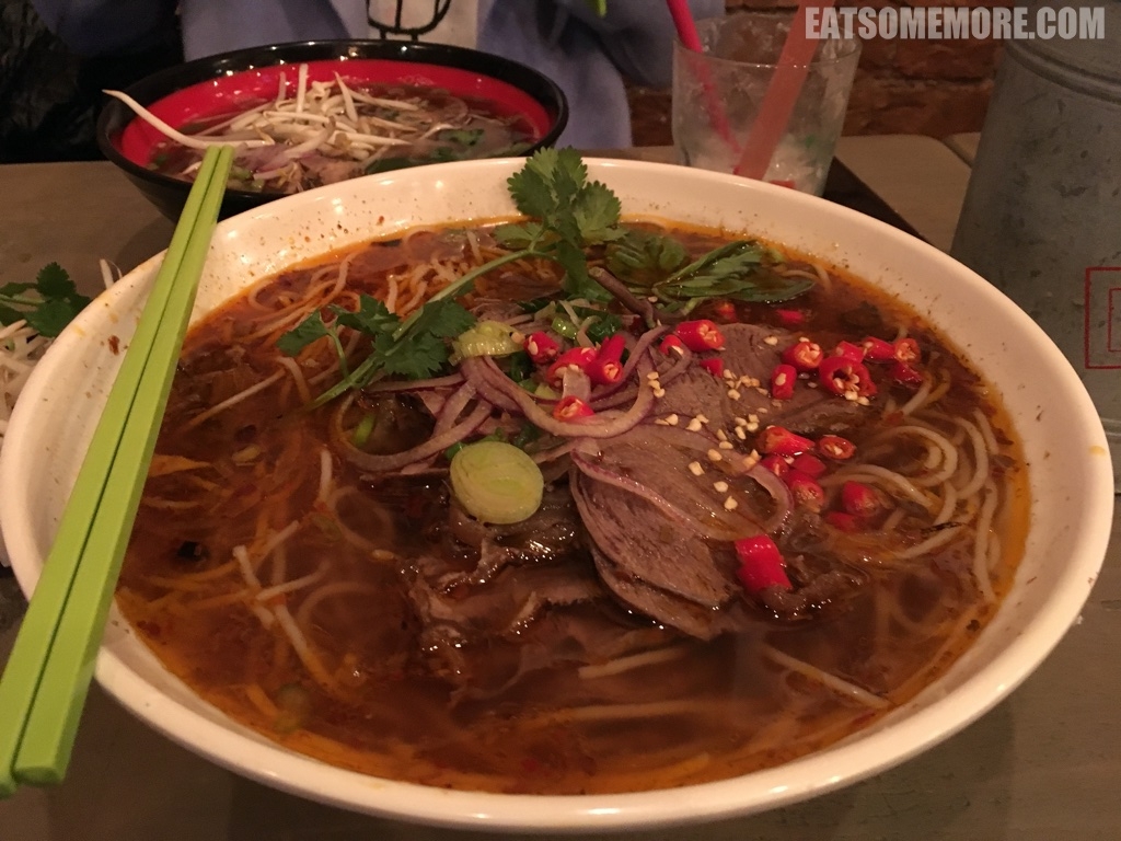 顺化牛肉粉 Bún bò Huế 的口味更复合一些,融酸、甜、鲜、香、辣为一体。大号版本比普通版大好多。一开始米粉比较有嚼劲,豆芽菜爽脆,香菜和柠檬草清新。吃过一阵子后,粉和牛肉都变得软了一些,还吸了很多汤汁,入味非常。