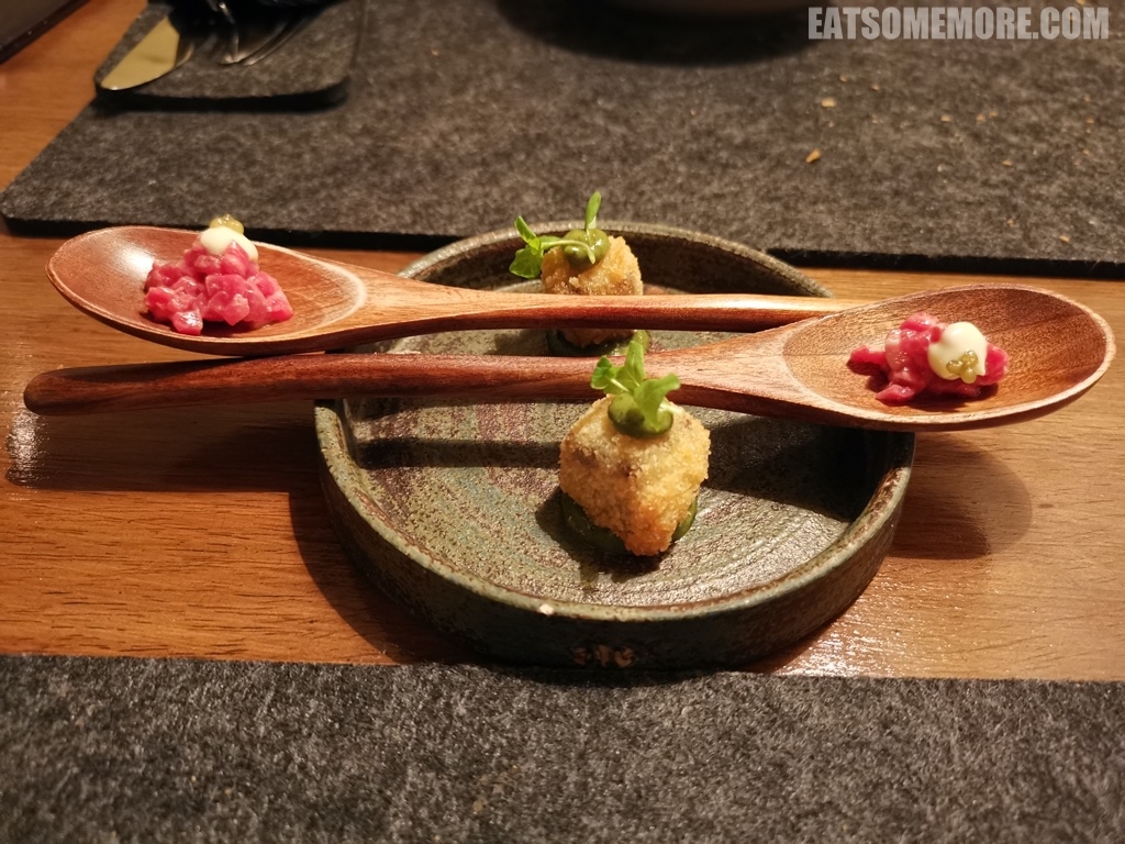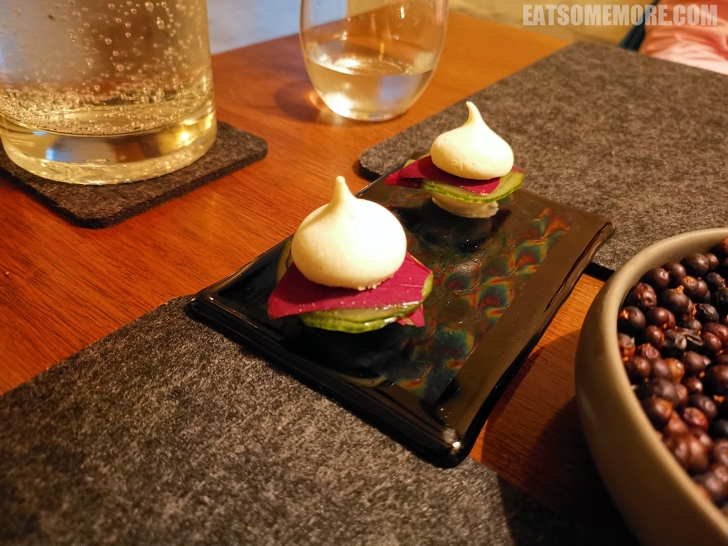 这三样当中最特别的当属清甜的黄瓜蛋白脆饼夹着甘鲜的蚝酱和略带刺激味道的腌黄瓜和蝴蝶酸模,多层次的味道鲜明又和谐。