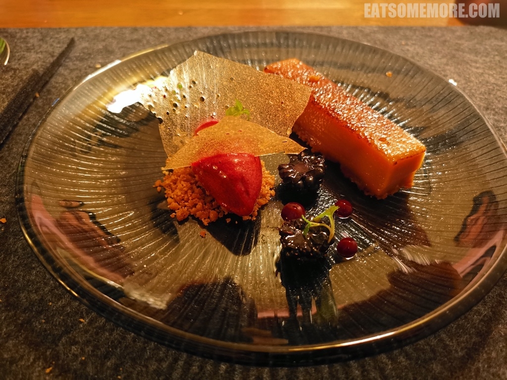 以昆布兰姜饼为底的焦糖朗姆卡仕达塔柔软香甜,通过黑莓和黑莓酱的桥梁,过渡到插着脆薄姜糖片的黑莓冰沙,酸甜灵动,齿颊留香。