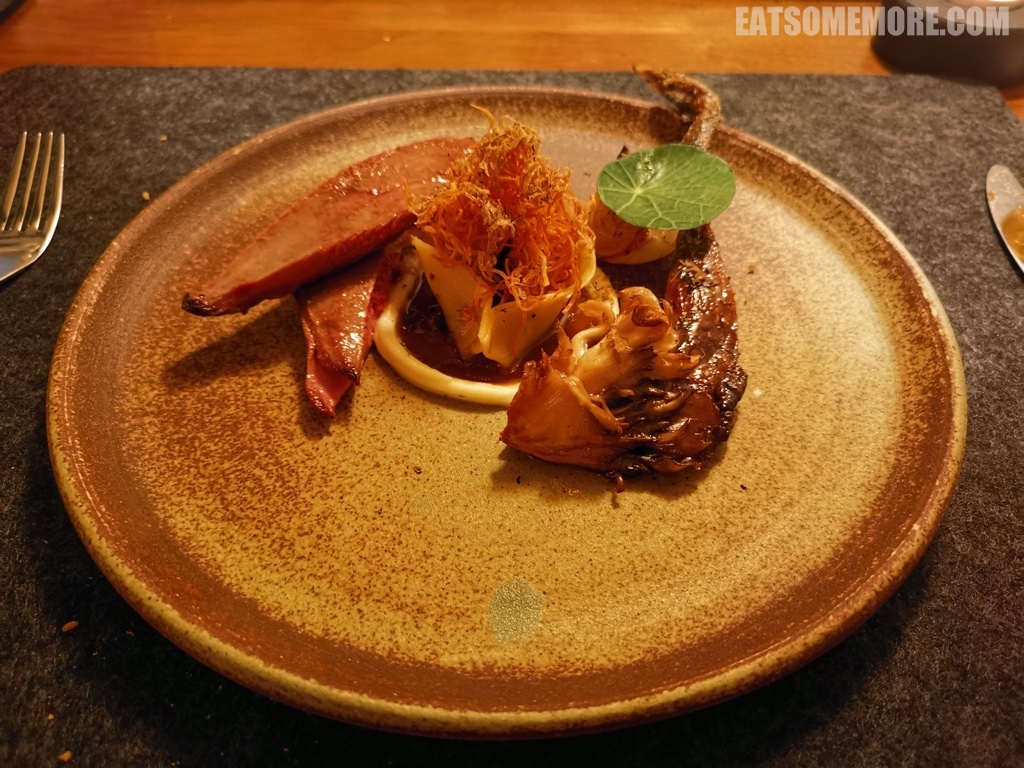 羽衣甘蓝被炸出了海苔的意思,下面的哈特尔浦现捕鳕鱼鱼排被烤得将将断生,表皮金黄,使用加入了烟熏科尼斯顿水域狗鱼籽的白奶油酱和腌菜蓟酱调味,鲜得层次分明。