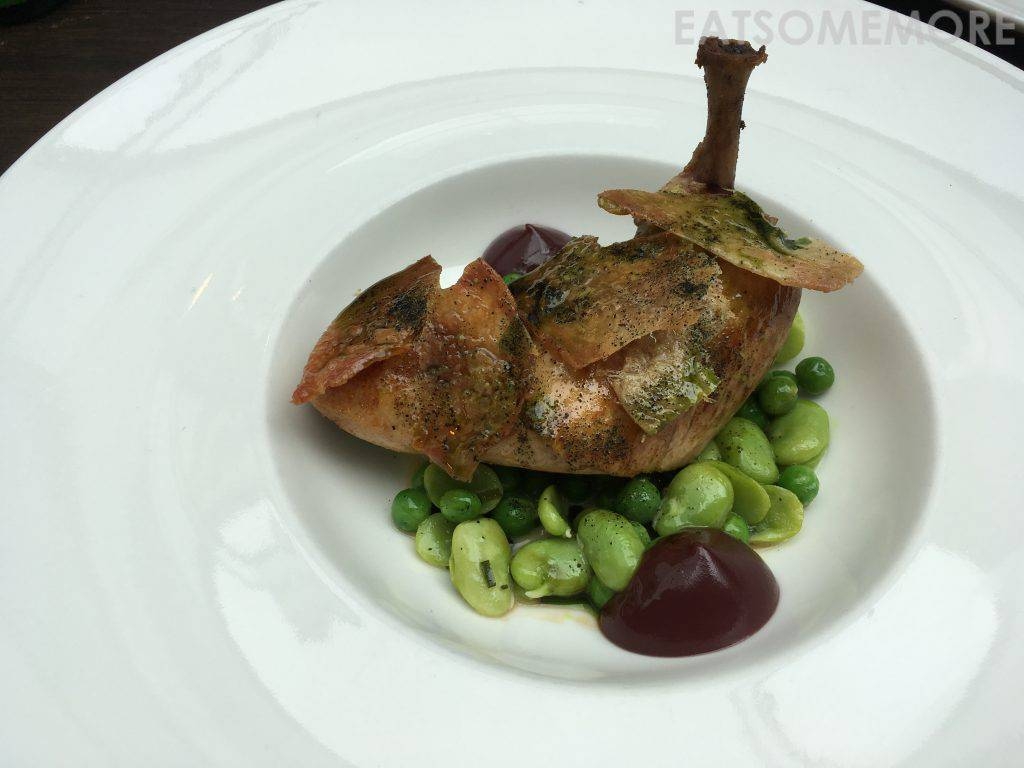 香蒜烤鸡皮脆肉嫩、香气四溢,搭配酸甜梅酱和清新的豌豆甜豆,田园风味淋漓精致。