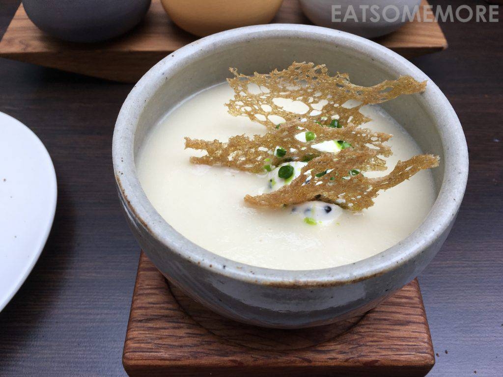 奶油菊芋烟熏线鳕浓汤,以香草奶油鲟鱼子酱提味,又与脆饼的口感相得益彰。