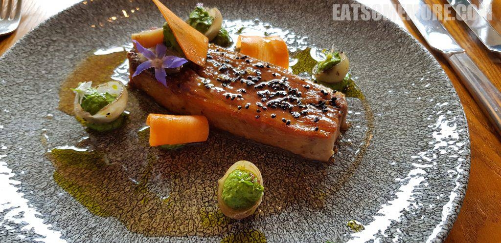 香煎羊臀肥瘦相间、鲜香软糯,搭配由奶酪、青瓜和林蒜打发成的青色的酱,盛在焦糖化的小洋葱里面,既解腻又增添了一份香甜。