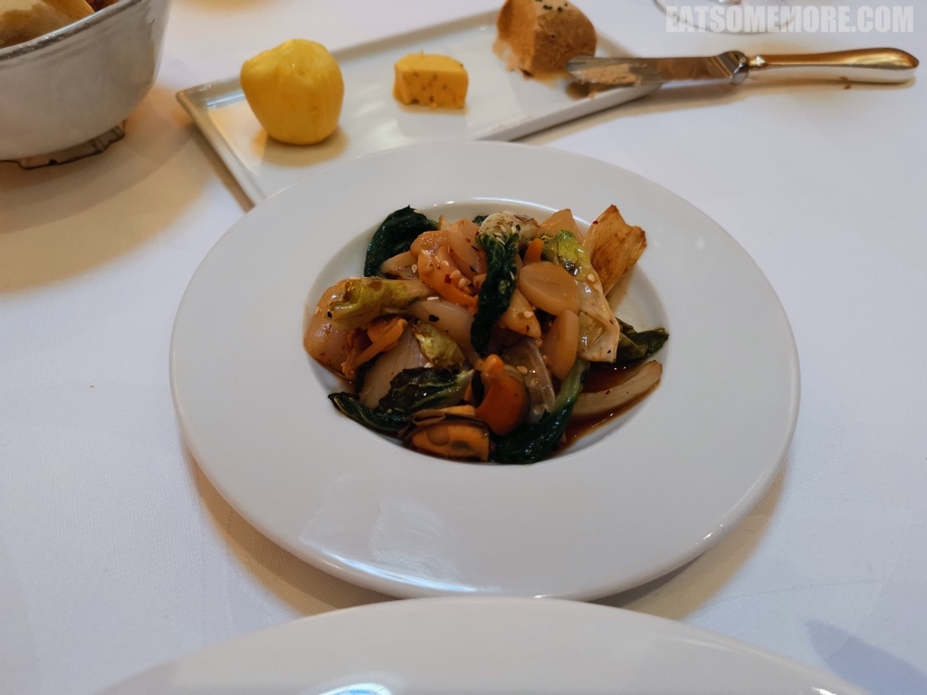 配菜是潜捞苏格兰扇贝、荚蛏和鸟蛤切了块跟白菜炒在一起,鲜香甘甜,海味爆棚,锅气十足。