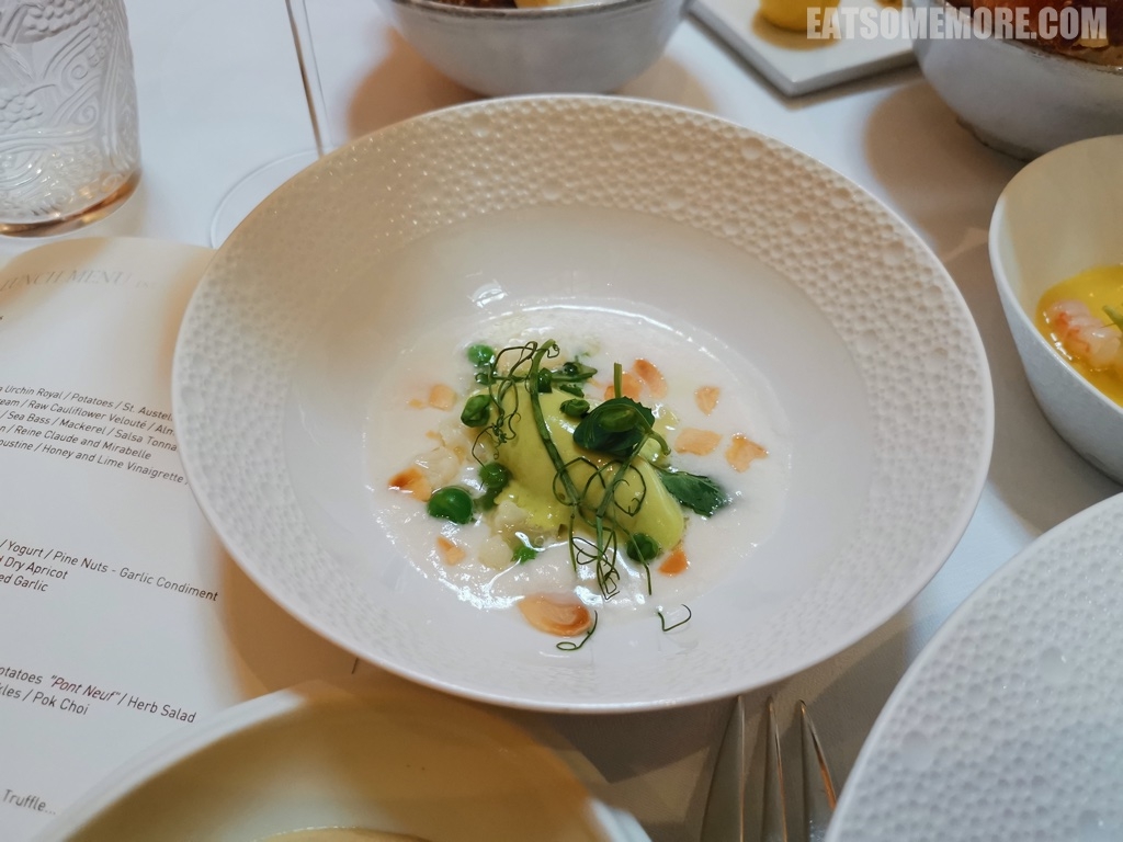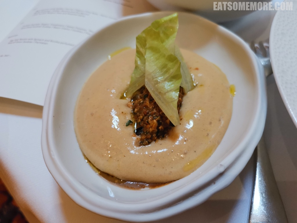 西班牙香肠、章鱼、海胆和康沃圣奥斯特尔青口纷纷处理成泥状,跟清甜的土豆浓汤拌在一起,即使鲜得上头,味道也稍微太重了一些。
