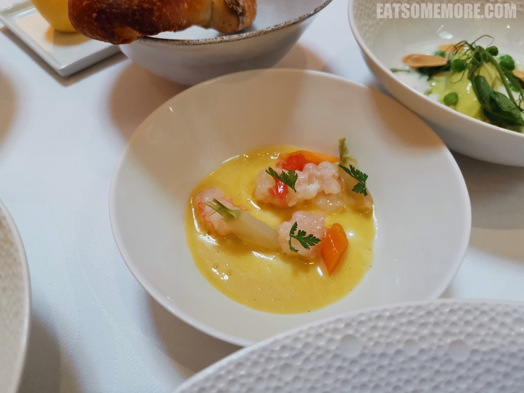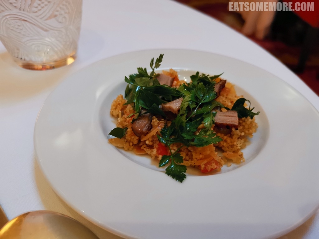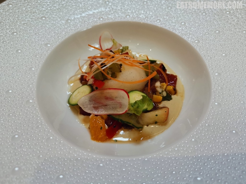 这天的高光之一当属这道味道层次极为丰富的鲔鱼酱杂蔬杂果海鱼刺身沙拉冷汤。刺身当中,蓝鳍金枪鱼软糯鲜甜,海鲈鱼鲜香,马鲛鱼脆弹。最妙的是在此基础上,酸甜清新的柠檬沙冰和杂蔬杂果,极大地激发了刺身的果鲜味。