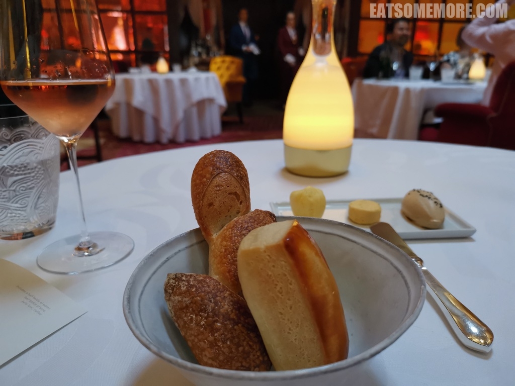 套餐包含半瓶葡萄酒,或者无酒精饮料。我的选择是优雅丝滑的2017年法国普罗旺斯地区餐酒。热热的佐餐面包有两种,分别是外脆内软湿润柔韧的麦穗状法棍和松软香甜的黄油面包。搭配的黄油有三个选择:盐味黄油、柑橘黄油和罂粟籽焦糖黄油,全都软软的,很容易在面包上推开。