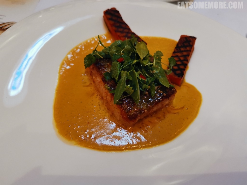 主菜康沃鳕鱼煮得很嫩,甚至还带点生,以西贡风格的香料沙拉和咖喱酱汁调味,口味稍重。绵软蓬松的厚切红薯“新桥”倒是香甜可口。