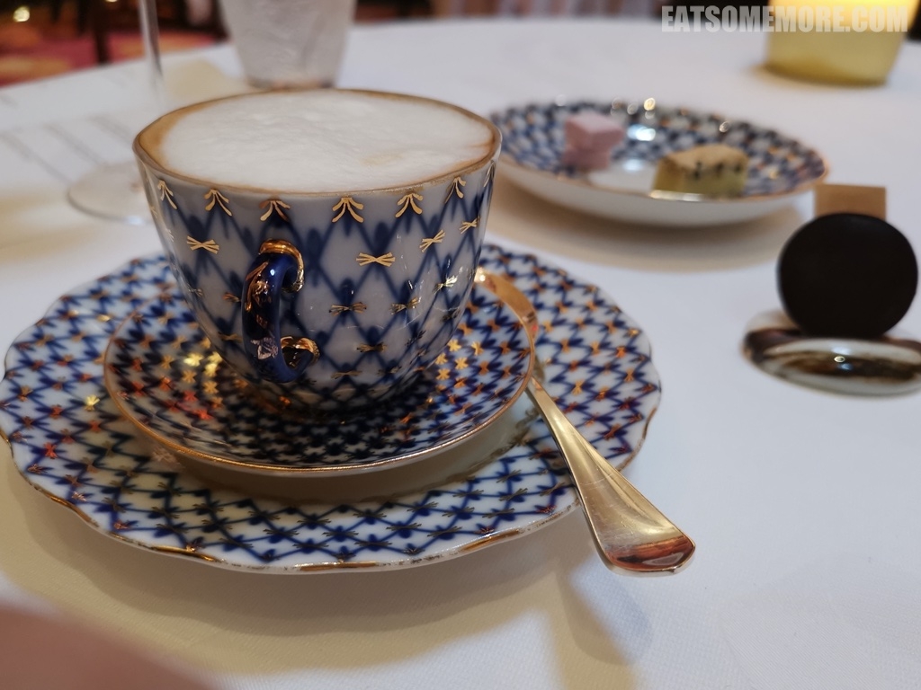 在这套美餐的尾声里,拿铁装在精致的描金青花三件套里,搭配的小甜点有: