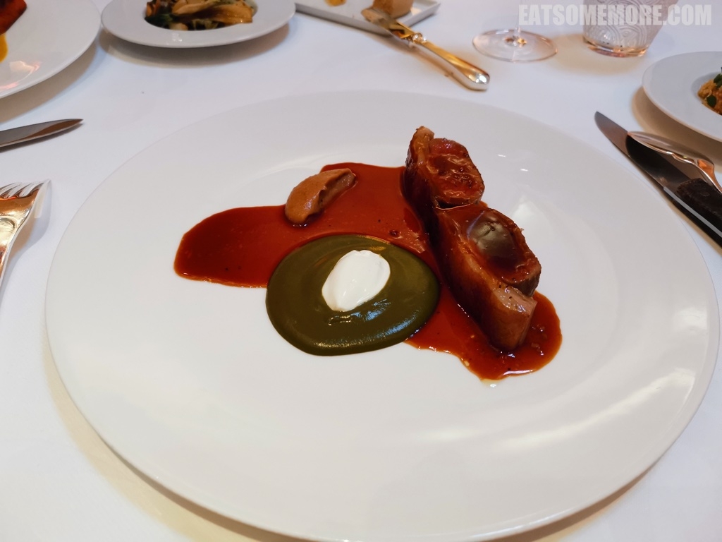 另一道主菜则是香煎西村羊臀,搭配酸模酱、酸奶油和松子蒜酱。开动之前,侍应还在羊肉上淋了烤蒜椰枣羊肉汁。羊臀去了骨,煎得火候刚刚好,肉质鲜嫩,嚼之有劲,油脂丰富,甘香多汁,回味悠长,齿颊留香。