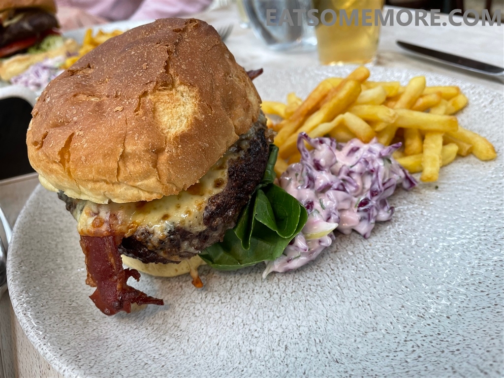主菜选择了风干熟成牛肉汉堡,配料十分丰富,包括烟熏培根、蒙特利杰克奶酪、生菜、番茄、黄瓜、是拉差蛋黄酱,紫甘蓝沙拉和薯条,用料十分扎实,吃完觉得自己仿佛参加了某种类型的大胃王挑战。