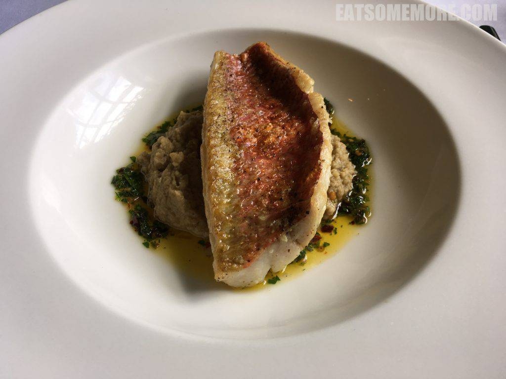 蒜油茄子泥顶香烤红鲻鱼。