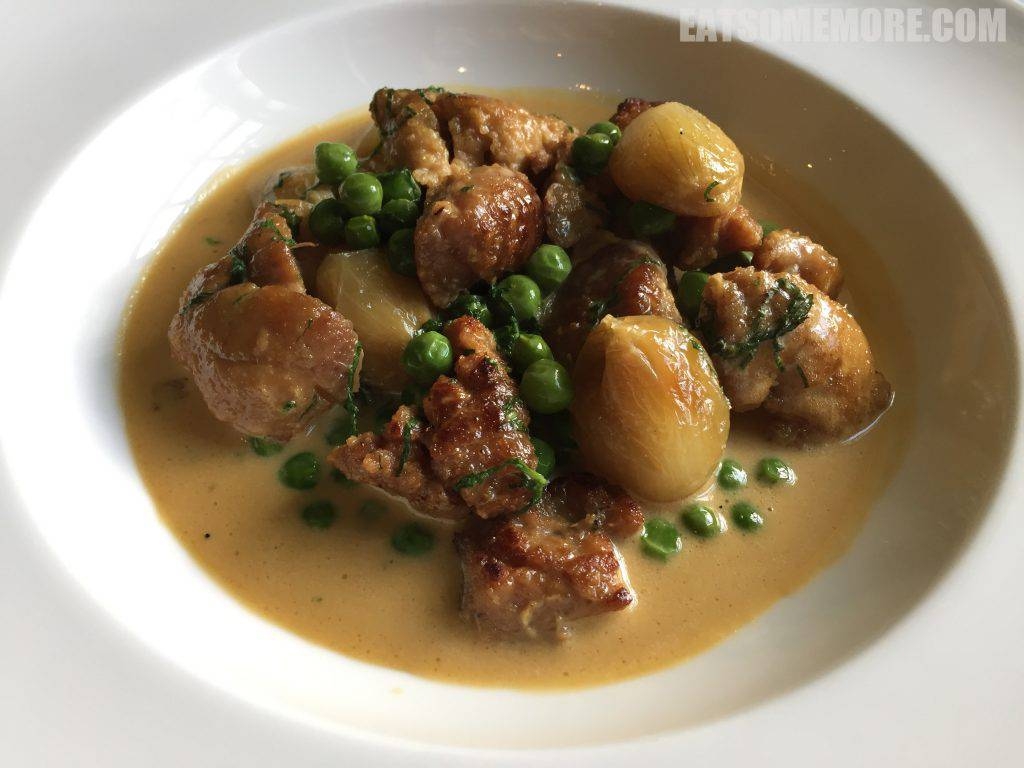 米其林一星的周日烤肉烹调恰到好处,外缘有嚼头,内里柔嫩多汁。多种配菜当中,油炸节瓜好吃到飞起。食材切得手指形状,裹粉细腻,外皮炸得香酥,节瓜脆甜,一根接一根,根本停不下来。
