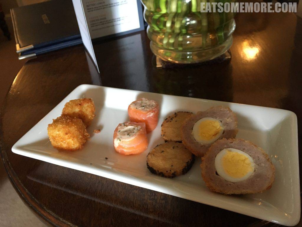 餐前小点的素质就已经出类拔萃。油炸芝士外脆内滑,奶油三文鱼卷幼滑咸鲜,炸饼香酥,苏格兰蛋香甜弹牙。