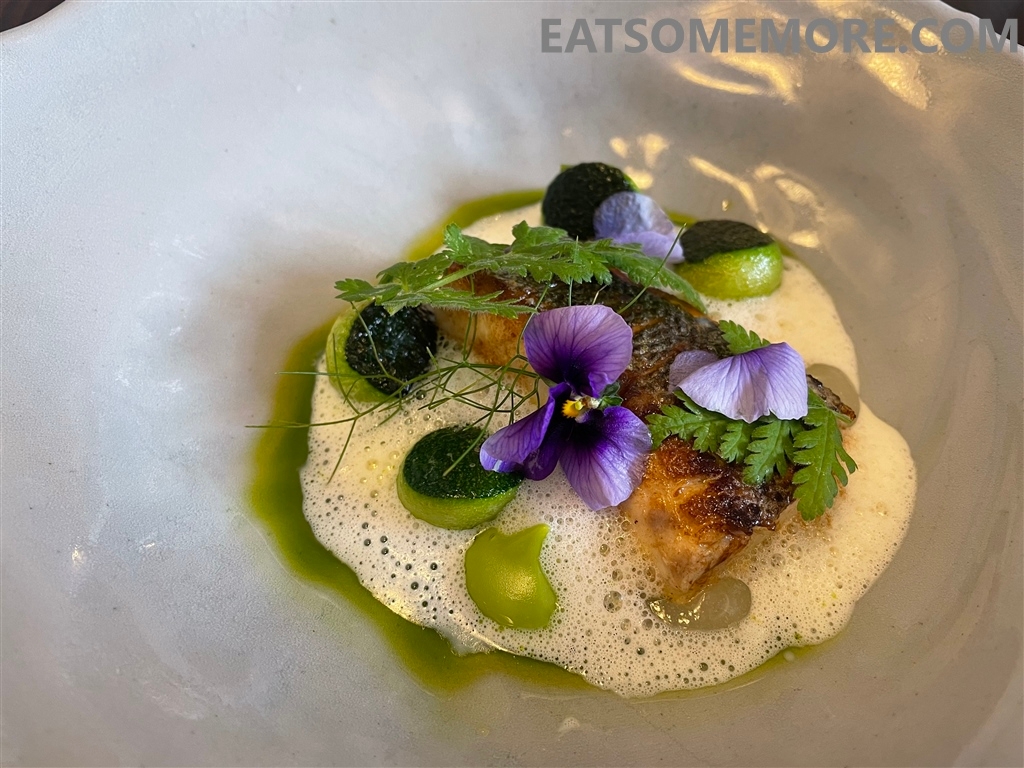 莫克姆湾野生鲈鱼,皮酥脆、肉鲜美,搭配柠檬果酸和脆嫩青瓜,正是清新动人英国夏天的味道啊!
