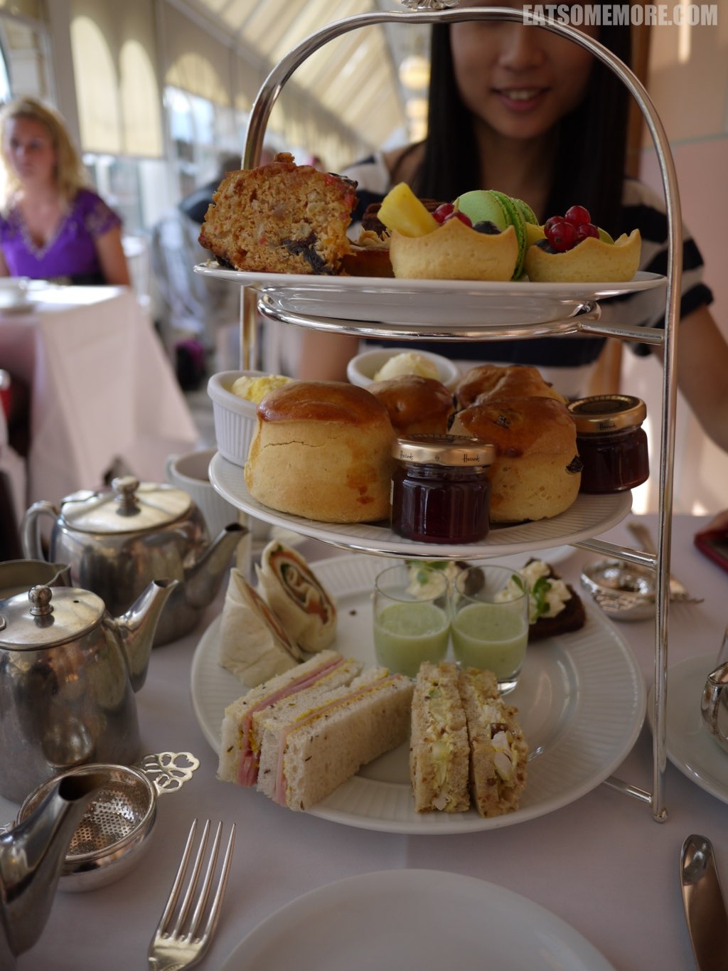 如何享受伦敦独有的购物体验?你有一个选择在买买买的同时,可以走走看看、可以了解 英国故事、也可以惬意悠闲地体会一下英国下午茶时光。夜晚远远就能看见整个房子在发光的就是传说中的哈罗德百货。在这个百货公司里面设有戴安娜和她的男朋友的纪念碑。哈罗德百货的乔治餐厅Geogian Restaurant的下午茶也是鼎鼎大名的。我看过许多介绍下午茶的文章和节目,可不可以容我严肃地跟大家说一说,英式下午茶,没有错是三层的,但是顺序是由下至上:三明治、司空饼、各式甜点。