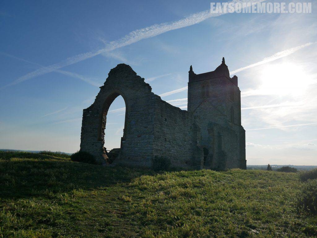 山顶上有一座教堂遗骸,如今被用于纪念在第二次世界大战中丧生的人们,在蓝天的映衬下有种悲凉的美感。