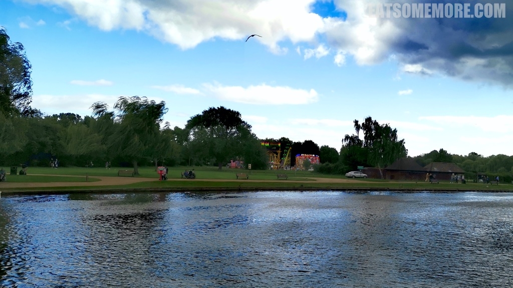 沿着莎士比亚剧院红砖建筑边的木栈道散步,红色的太阳伞与绿树相映成趣,蓝色的船停泊在缓缓转动的摩天轮下。