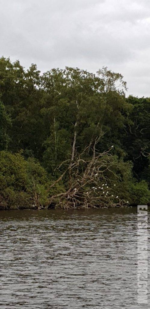 湖边的树木上停了许多白色的水鸟。