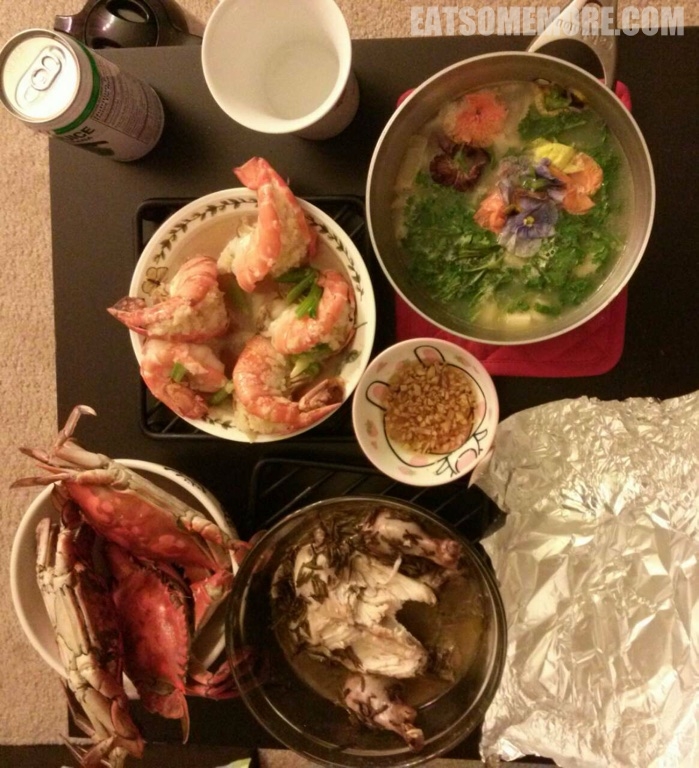 于是我就遇见了好多好多各种大小的虾兵蟹将,当然还有马里兰的蓝蟹。朋友一直说蓝蟹肉质不好,但是我这个杭州人的胃觉得,蓝蟹劈开浸在黄酒里一蒸,蟹肉的甜和黄酒的甜融为一体,真是大美味!