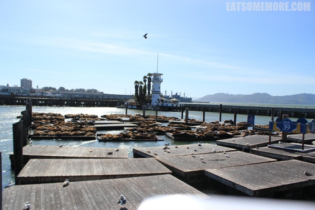 在39号码头与一大群海狮不期而遇,望着它们湿漉漉的爬上来晒到一身土的效果,同时发出慵懒的咿咿唔唔声,差点没赶上去看监狱岛和旧金山大桥的大船。