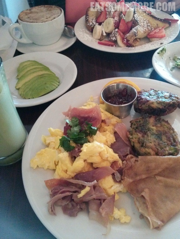 咱们吃早餐的地方位于圣莫妮卡海滩附近。煎蛋可丽饼搭配生火腿和炸土豆饼,营养又美味。法式吐司搭配草莓、香蕉和糖浆。我超级喜欢这个法式吐司,厚度饱满,先泡过牛奶,再煎两面,搭配上新鲜水果也太好吃了吧!