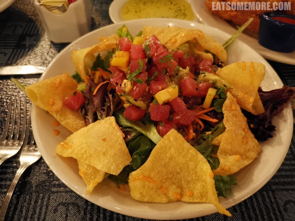 稍事休息后从酒店出发步行大约五分钟就到达了 Juno Beach Fish House 吃晚餐。吞拿鱼生沙拉里加入了芒果粒,酸甜果味和鲜甜海味相得益彰。