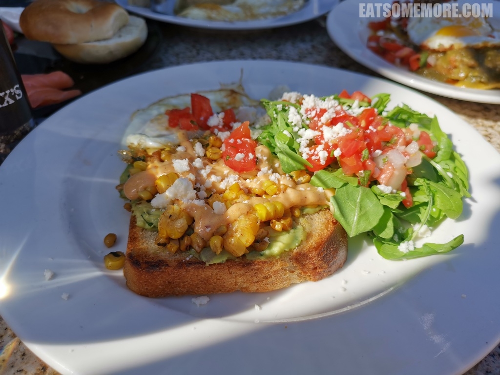 煎蛋牛油果土司上铺满了墨西哥玉米粒、科蒂哈干酪、芝麻菜和番茄粒。
