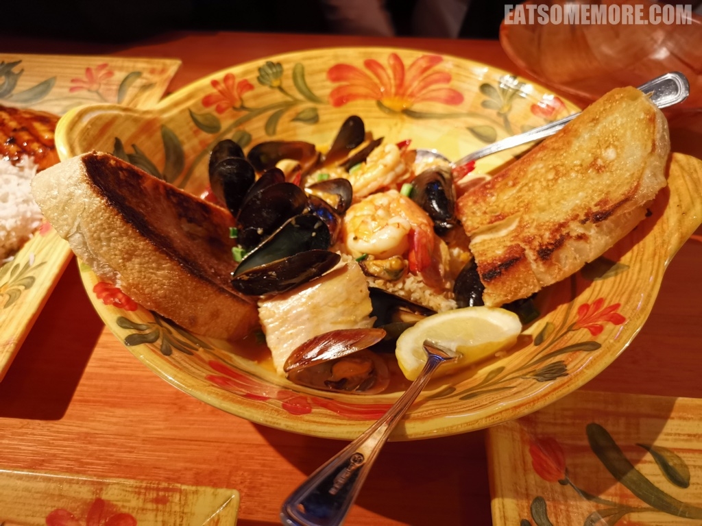 加勒比海鲜拼盘装着大虾、青口、蛤蜊和鱼块。面包烤到有些焦脆,沾一沾海鲜汤汁,美味升级。