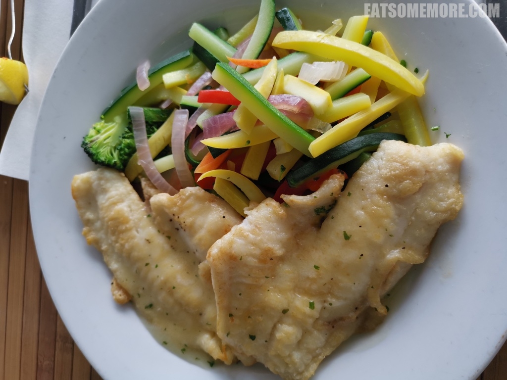 晚餐时我们来到了棕榈滩花园小镇上的海鲜餐厅 Cool’a Fish Bar。油炸红鲷鱼上淋了酸甜的酱汁,配菜是芦笋和椰子饭。