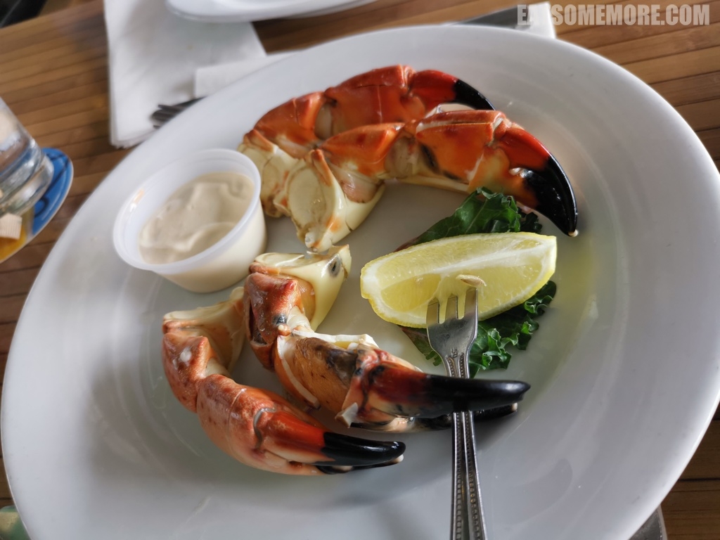 中号石蟹蟹钳只是用水煮过,可以选择用柠檬和蛋黄酱调味。蟹壳已经事先被敲碎,可以轻松食用。食材新鲜,鲜甜多汁。
